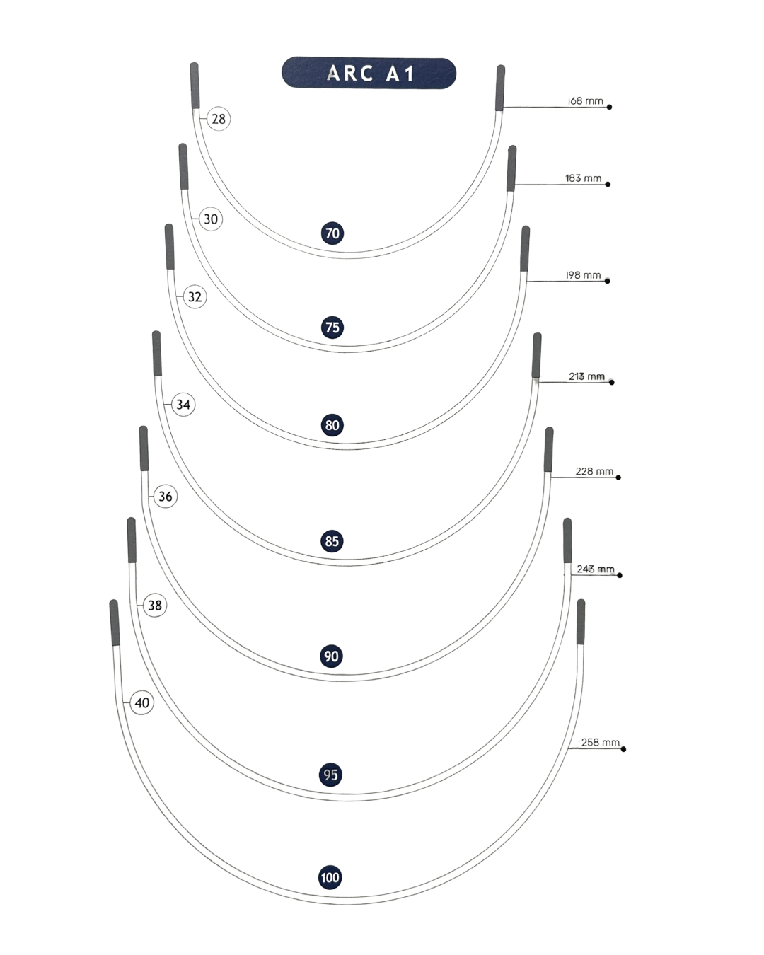 Arco de brasier Ref. A1 (Tallas 28 a 40)El Arco Ref. A1 es un insumo básico y confiable para la confección de brasieres y prendas de corsetería. Su diseño anatómico brinda soporte, realce y estabilidad, adaptándose de manera cómoda al busto.
