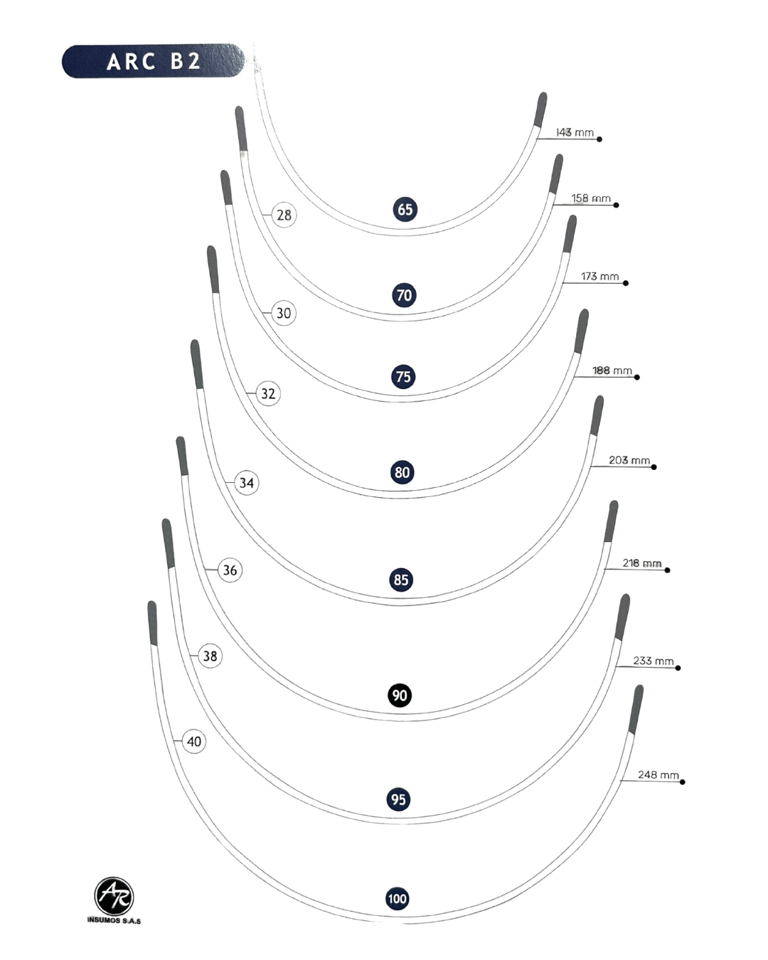 Arco de brasier Ref. B2 (Tallas 26 a 40)El Arco Ref. B2 es un insumo confiable para la confección de brasieres y prendas de corsetería. Su diseño anatómico brinda soporte, realce y comodidad, adaptándose a la forma natural del busto para un ajuste firme y estético.